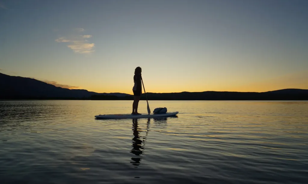 Vi vandrar tillsammans till en mindre sjö. Vid sjön hittar vi en varsin SUP, stand up paddle board, som vi packar och gör iordning för att paddla iväg.